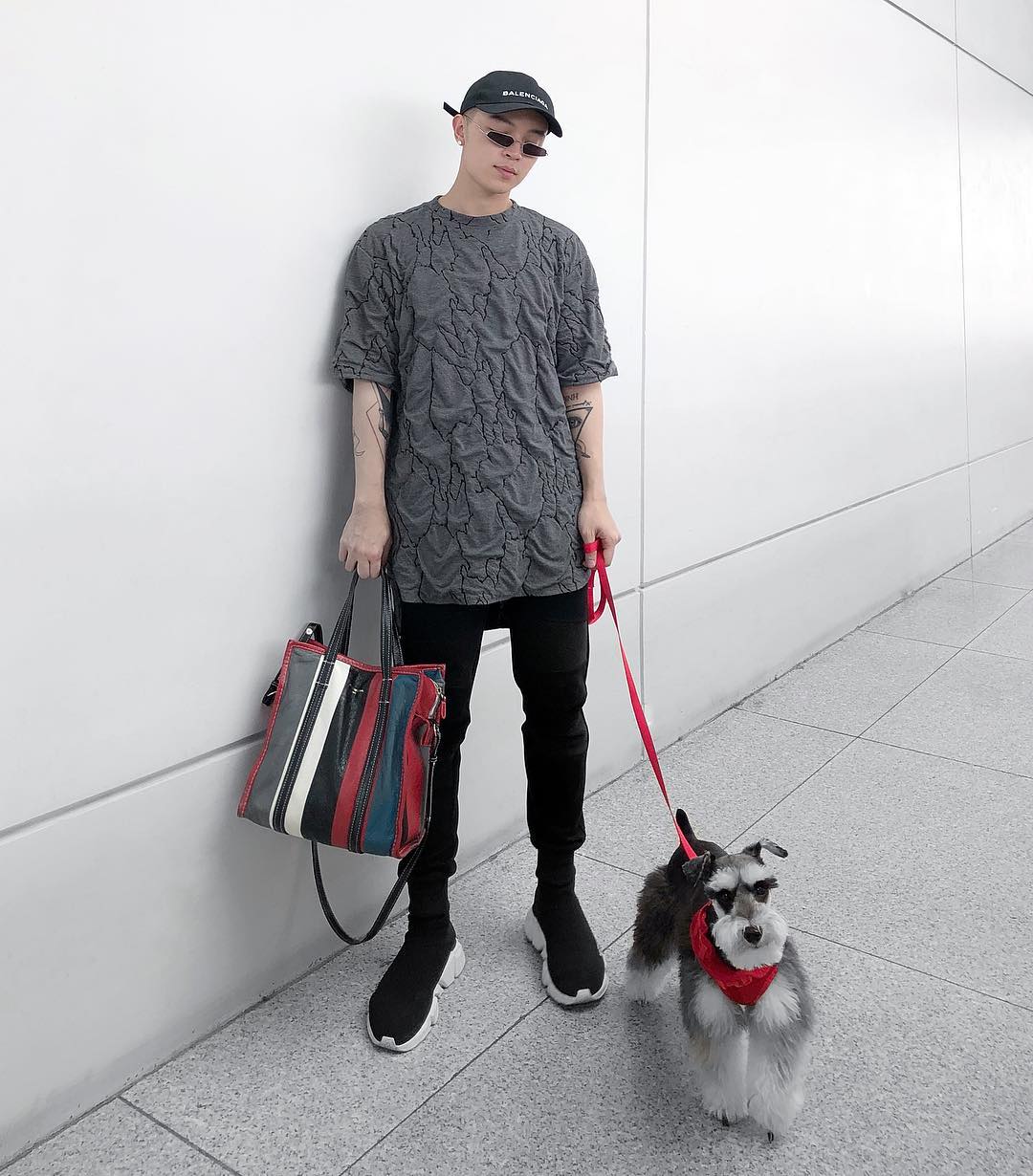 Chiếc áo thun đặc biệt cùng túi bản to màu sắc của Balenciaga là điểm nổi trội của Kelbin trong set đồ này.