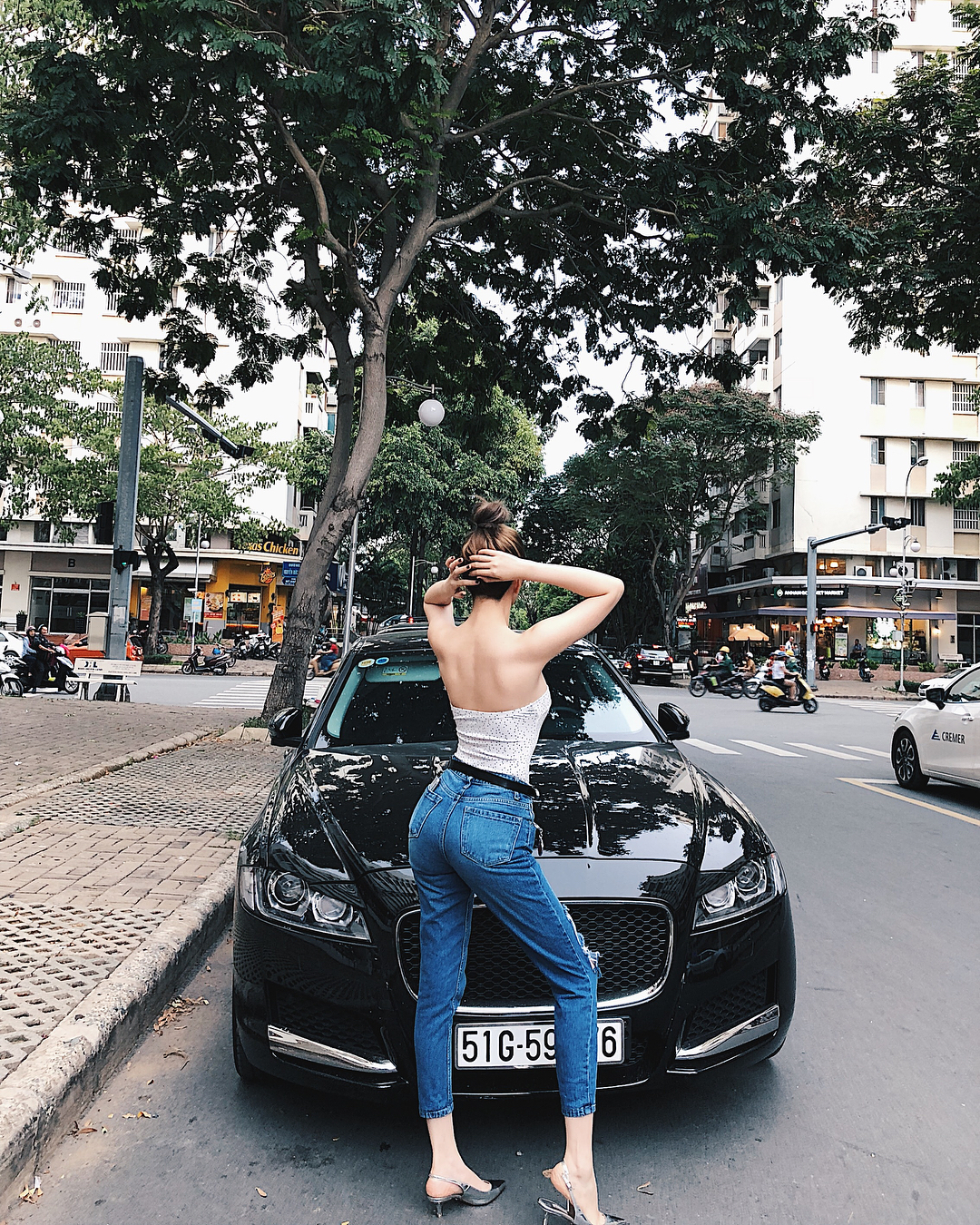 Thiều Bảo Trang đốt mắt người hâm mộ khi tạo dáng xoay lưng, khoe trọn vòng 3 “khủng”. Cô nàng cũng ăn diện rất gợi cảm với áo hở lưng, khoe bờ vai nõn nà cùng quần jeans ôm sát.