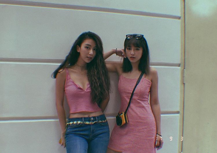 Quỳnh Anh kết hợp crop top xẻ ngực sâu cực táo bạo với quần jeans xanh màu basic. Bên cạnh cô bạn thân Salim với chiếc váy hai dây kẻ gingham xinh xắn.