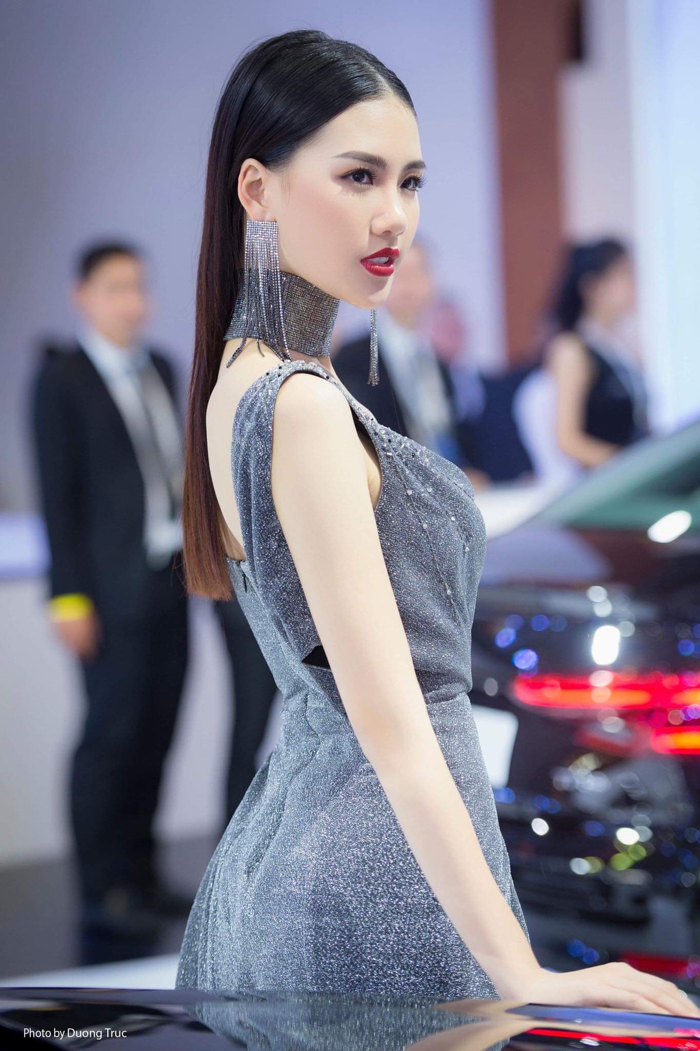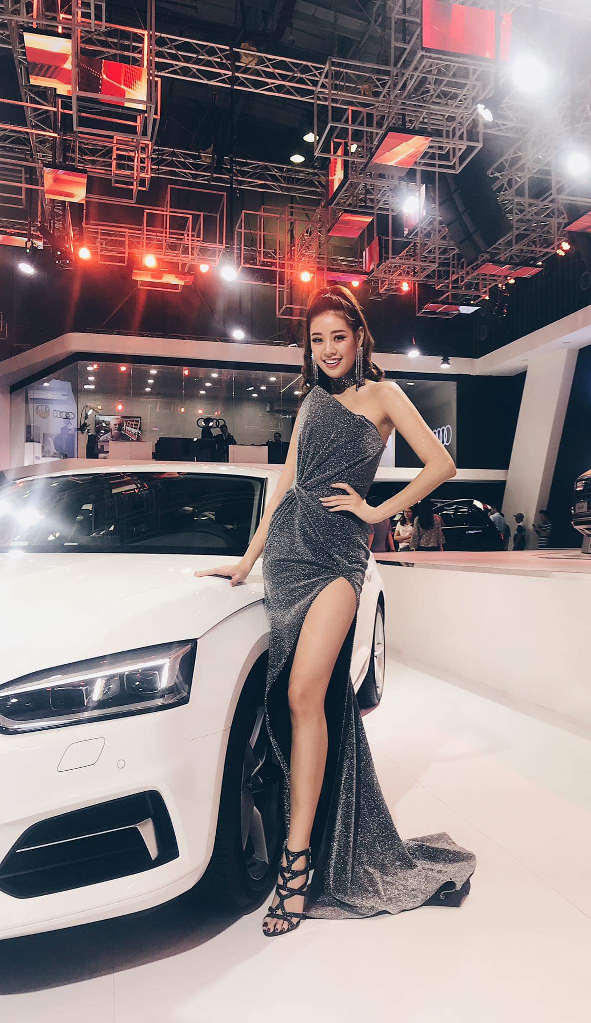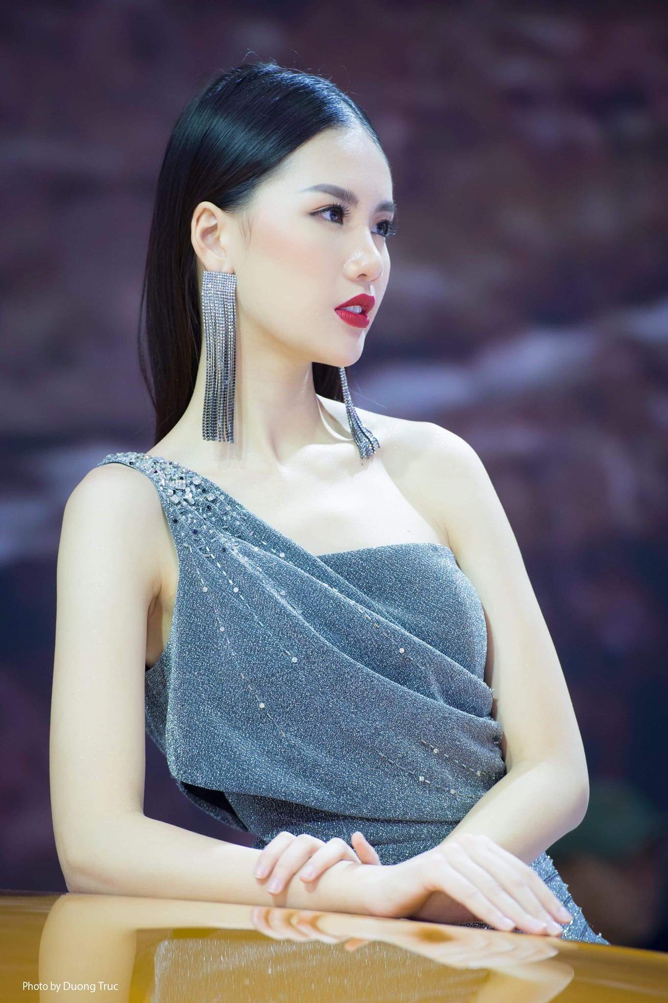 Giải vàng Siêu mẫu Việt Nam 2018 Quỳnh Hoa khoe dáng thanh tao, son sắt trong chiếc váy ôm sát, chất liệu dạ lấp lánh khi làm mẫu tại một sự kiện nổi tiếng về ô tô.