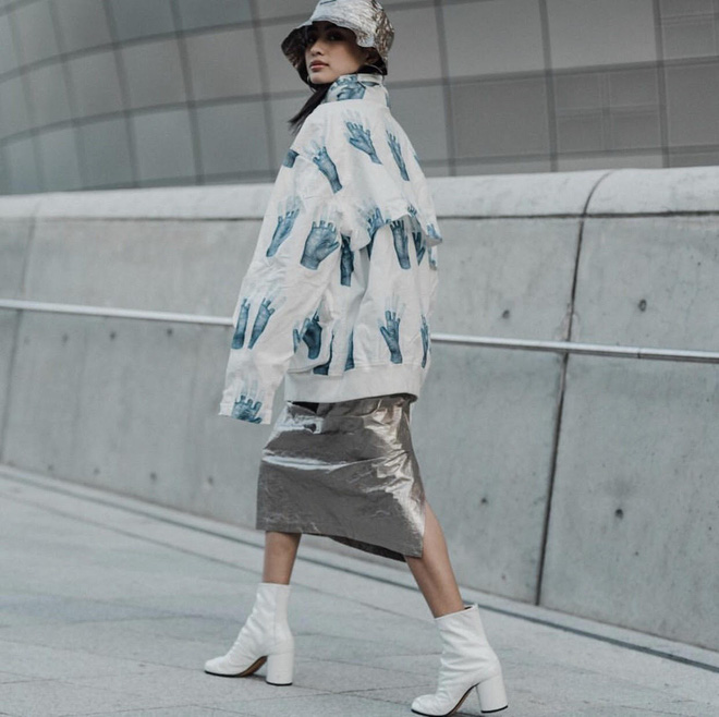 Hot girl Dương Minh Ngọc ghi điểm trên đường phố Seoul với set đồ tông màu xanh, trắng mix cùng mũ mix cùng mũ bucket và chân váy ánh kim.