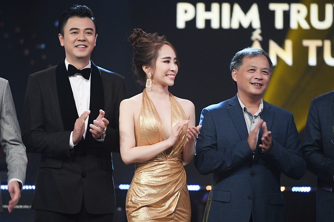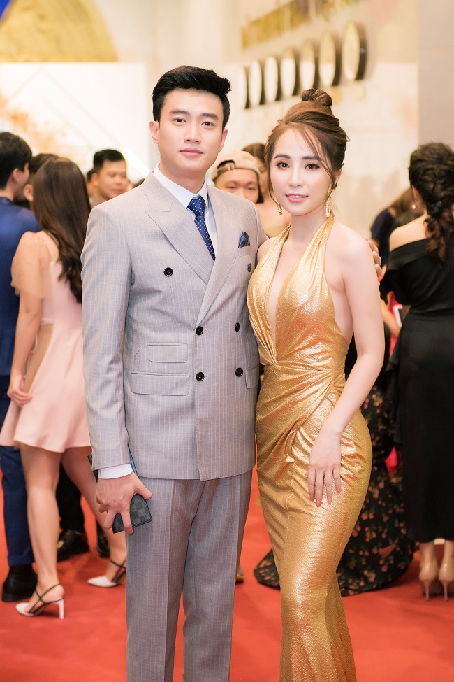 Tạo dáng nuột nà bên cạnh bạn diễn Quốc Trường tại sự kiện