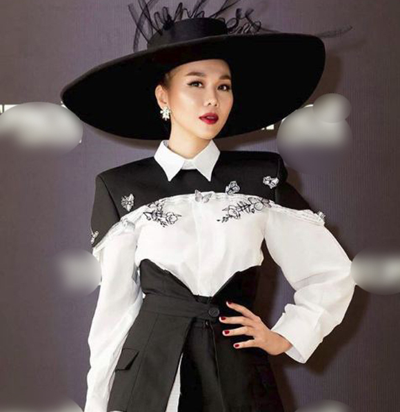 Cô còn nhấn nhá khiến set đồ nổi bật hơn nhờ chiếc nón rộng vành màu đen có đính tên mình một cách cầu kỳ. Tuy nhiên, chiếc nón được làm tinh xảo vô cùng hợp với bộ suits Thanh Hằng đang mặc trên người khiến người đẹp thêm phần tỏa sáng.