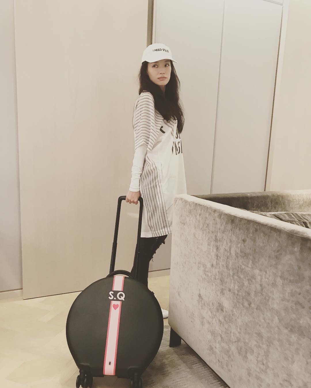 Streetstyle thường thấy của Thư Kỳ là áo thun freesize, quần jeans rách gối, giày sneaker và mũ lưỡi trai.