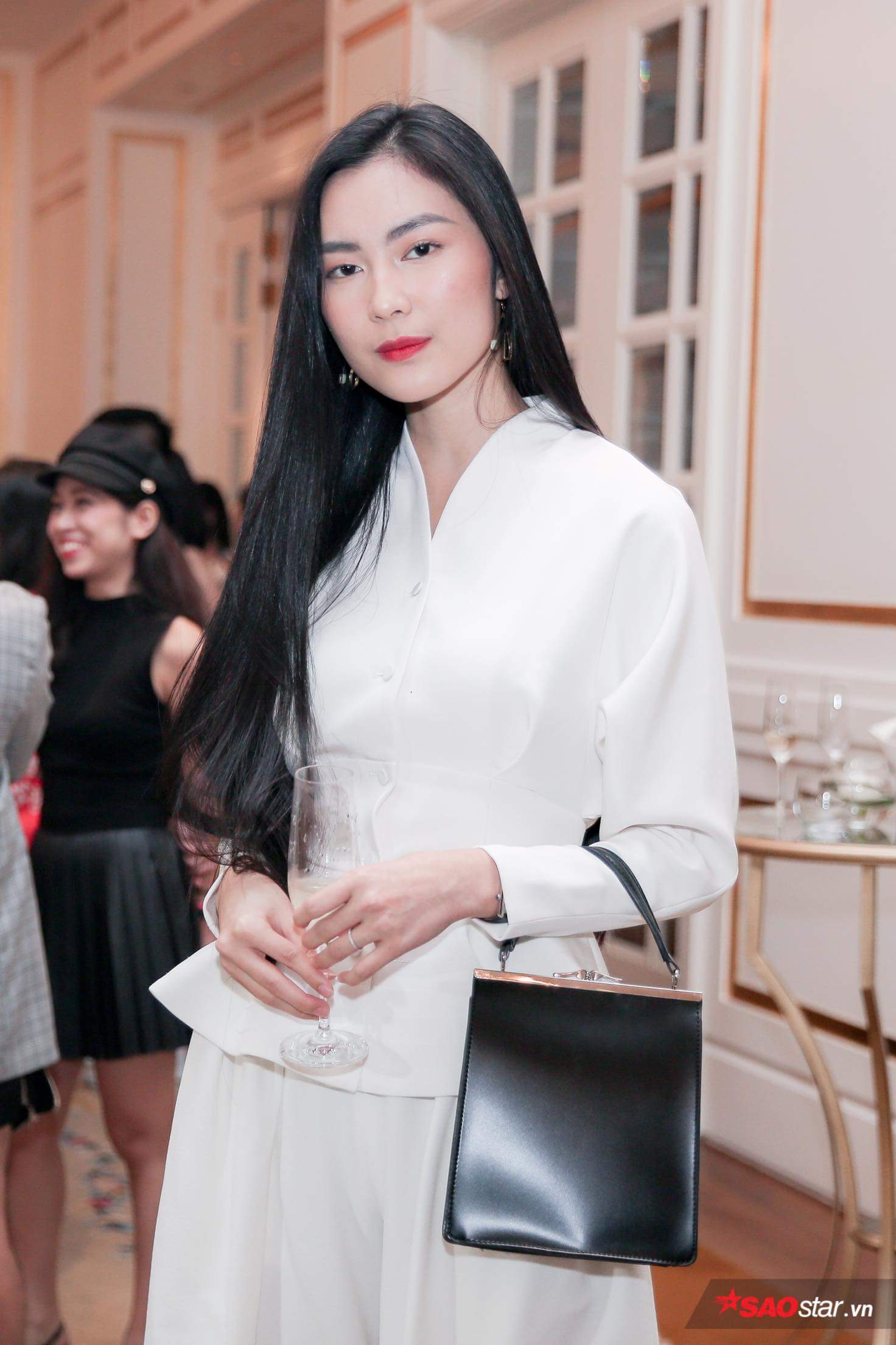 Helly Tống sử dụng chiếc túi đen để làm điểm nhấn cho outfit trắng ngần.