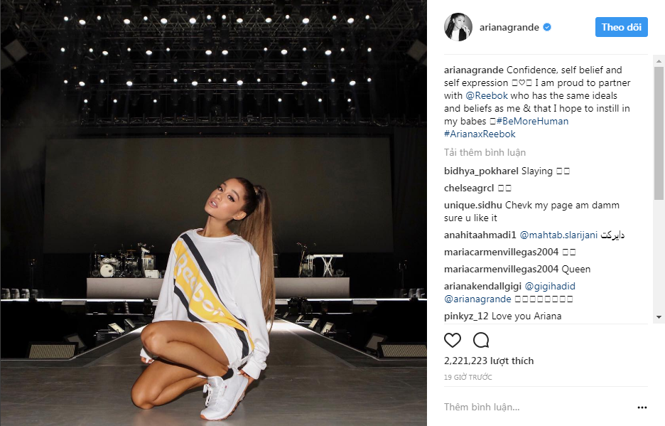 Trước kia, vedette thương hiệu này không ai khác ngoài Gigi Hadid, và Ariana Grande hứa hẹn sẽ là “con gà đẻ trứng vàng” vô cùng tiềm năng bởi đến thời điểm này, “tiểu diva” đã sở hữu hữu lượng theo dõi hơn 100 triệu người, hoàn toàn có lợi cho dự án nhân quyền mang tên Be More Human của Reebok.