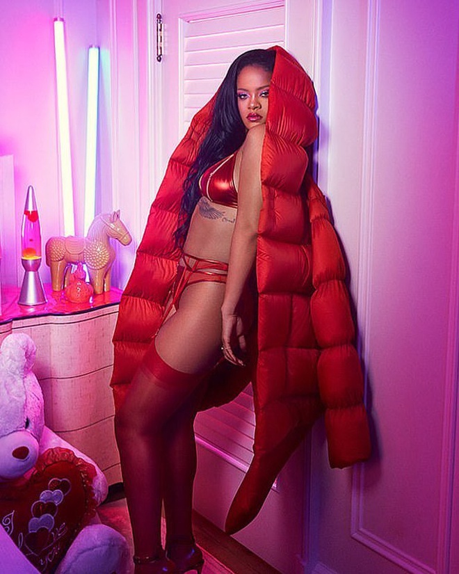 Rihanna chọn áo phao màu đỏ dáng dài mix cùng với bộ nội y mà mình mặc trên người