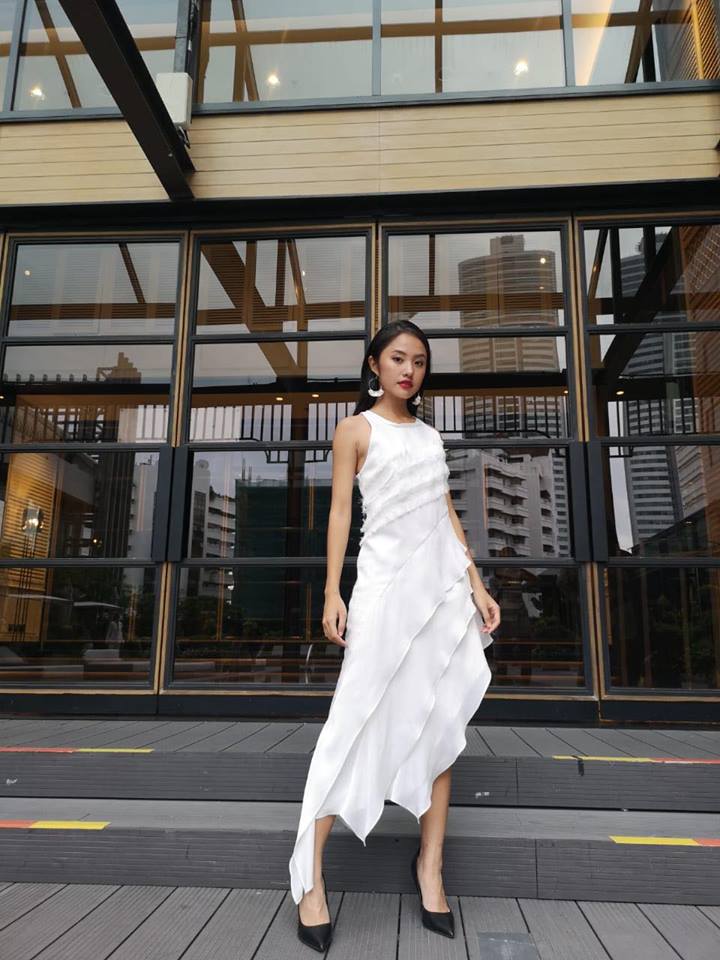 Thanh Vy chọn cho mình một chiếc đầm trắng thiết kế cách tân cùng với đôi bông tai oversized với mái tóc đen dài và tông makeup màu son đỏ nổi bật