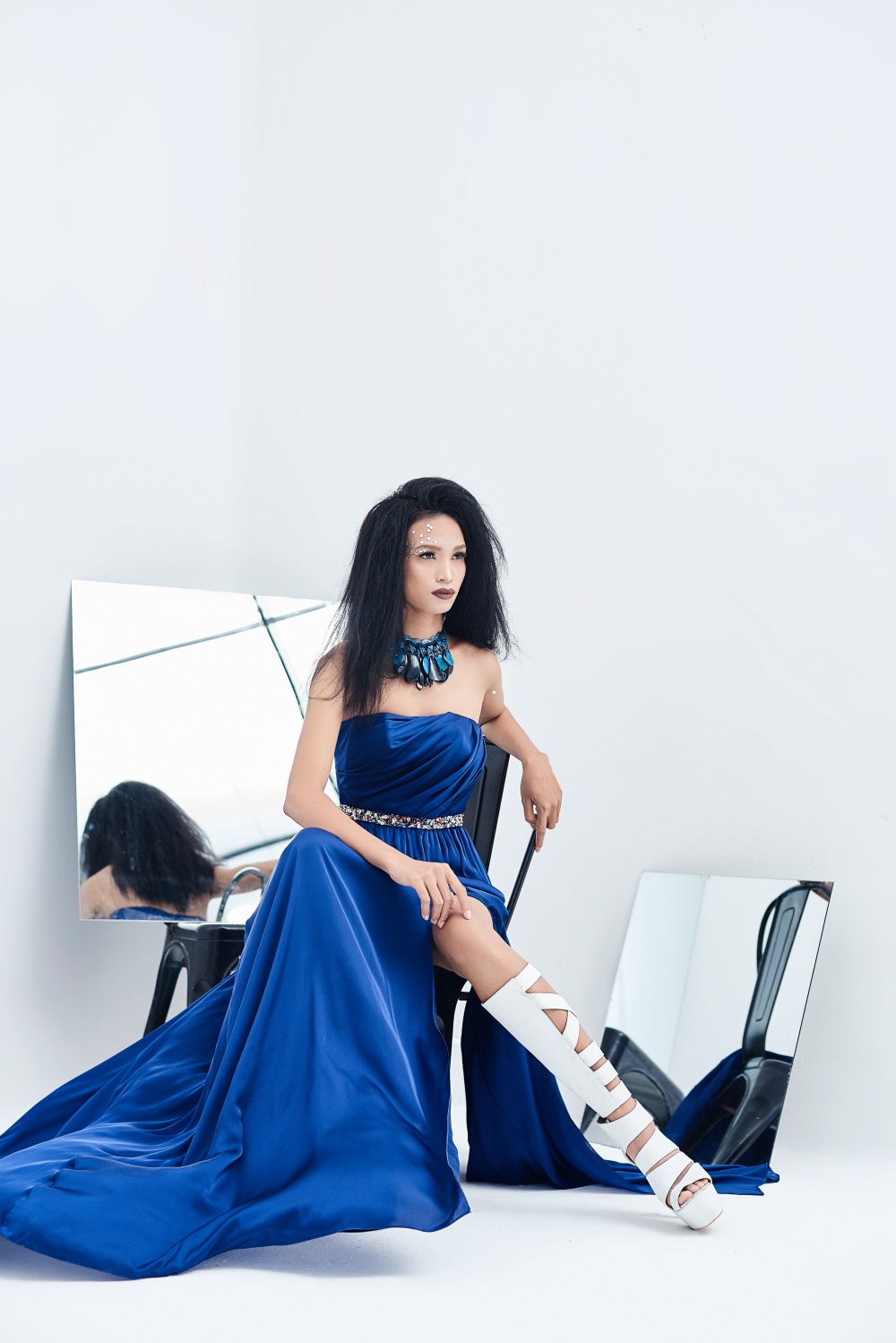 Khoác lên mình chiếc váy màu xanh ngọc người đẹp gốc Đắk Lắk khoe được vẻ đẹp thướt tha, mềm mại. Sử dụng chất liệu lụa chiffon kết hợp với những viên đá màu đen được đính kết thủ công, tỉ mỉ và những phụ kiện vòng tay đi kèm, bộ cánh tôn lên nét đẹp dịu dàng nhưng cũng không kém phần cá tính của nàng siêu mẫu 9X.