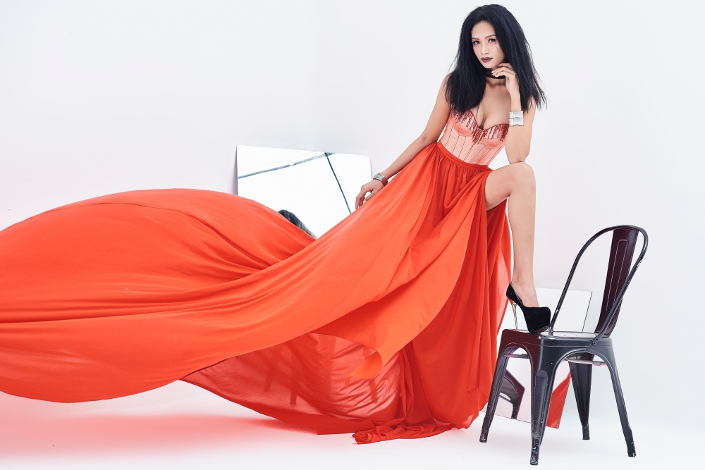 Trong bộ đầm đỏ rực rỡ, cùng phần cúp ngực được đính đá tinh xảo giúp người đẹp 9X tôn lên bộ ngực căng đầy cũng như đôi chân thon dài, khoẻ khoắn của mình.