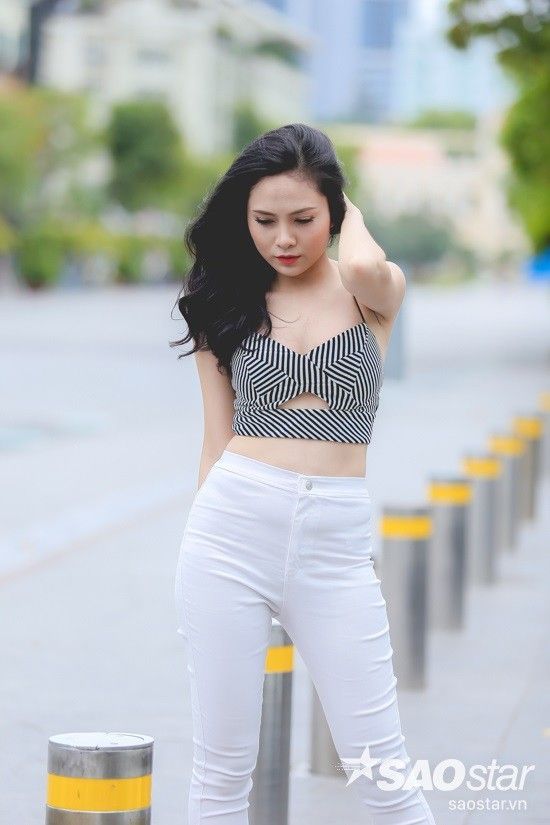 Trưởng nhóm chọn cho mình phong cách thể thao gợi cảm với croptop kẻ sọc.