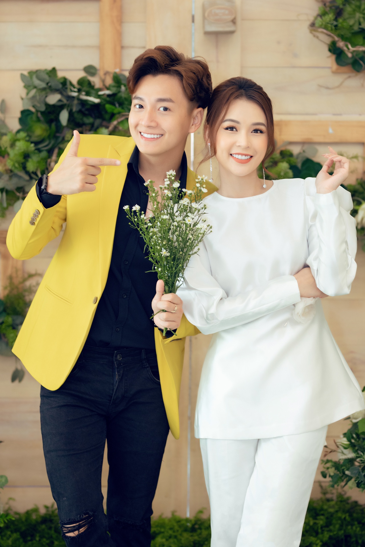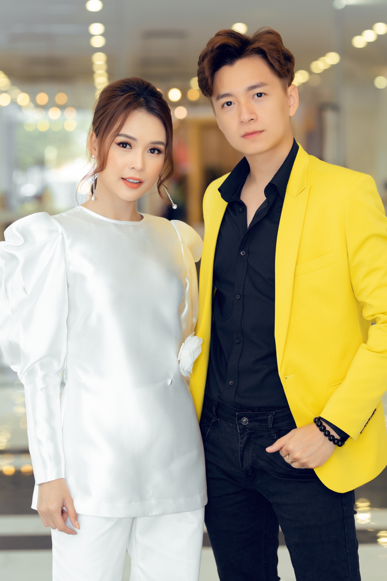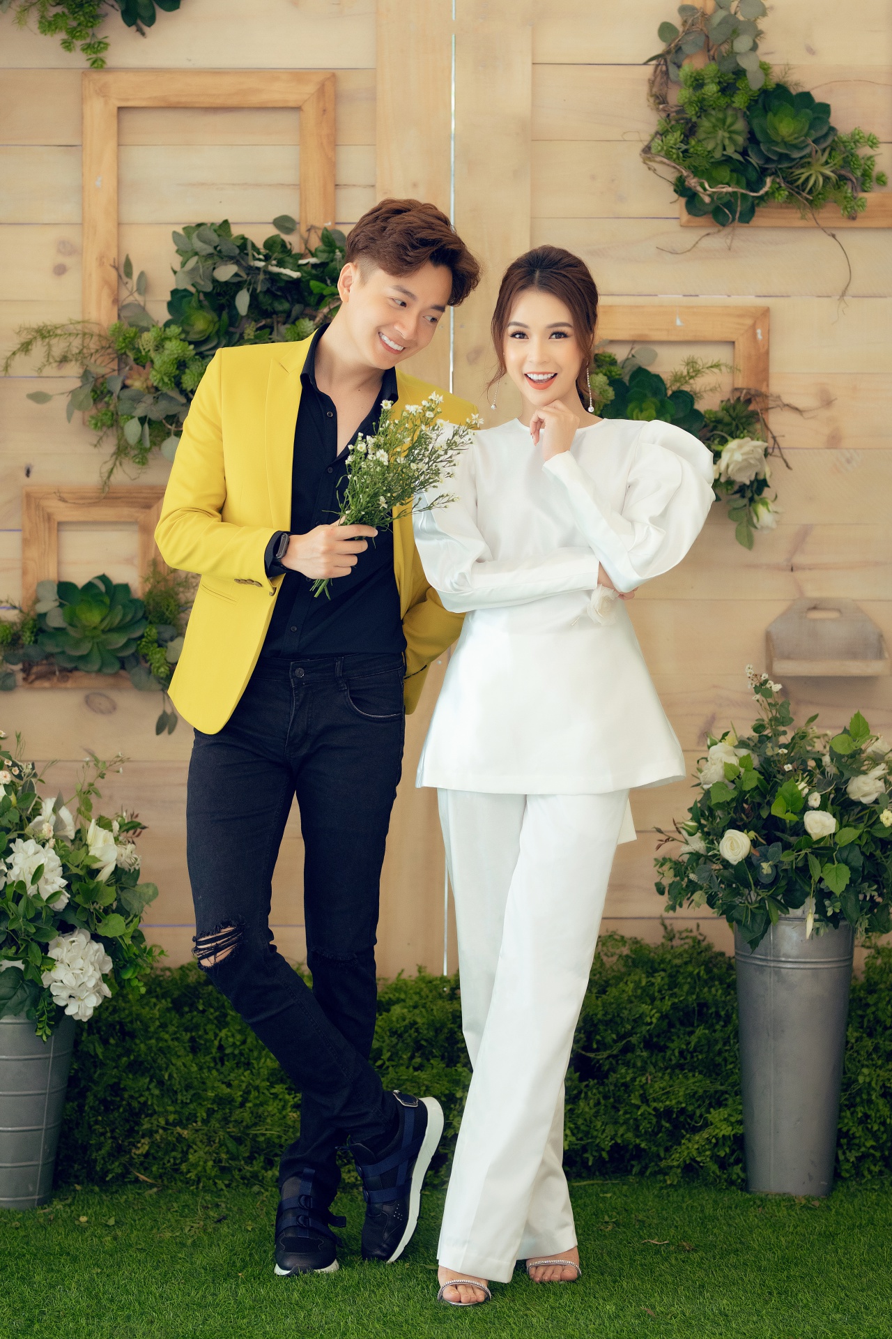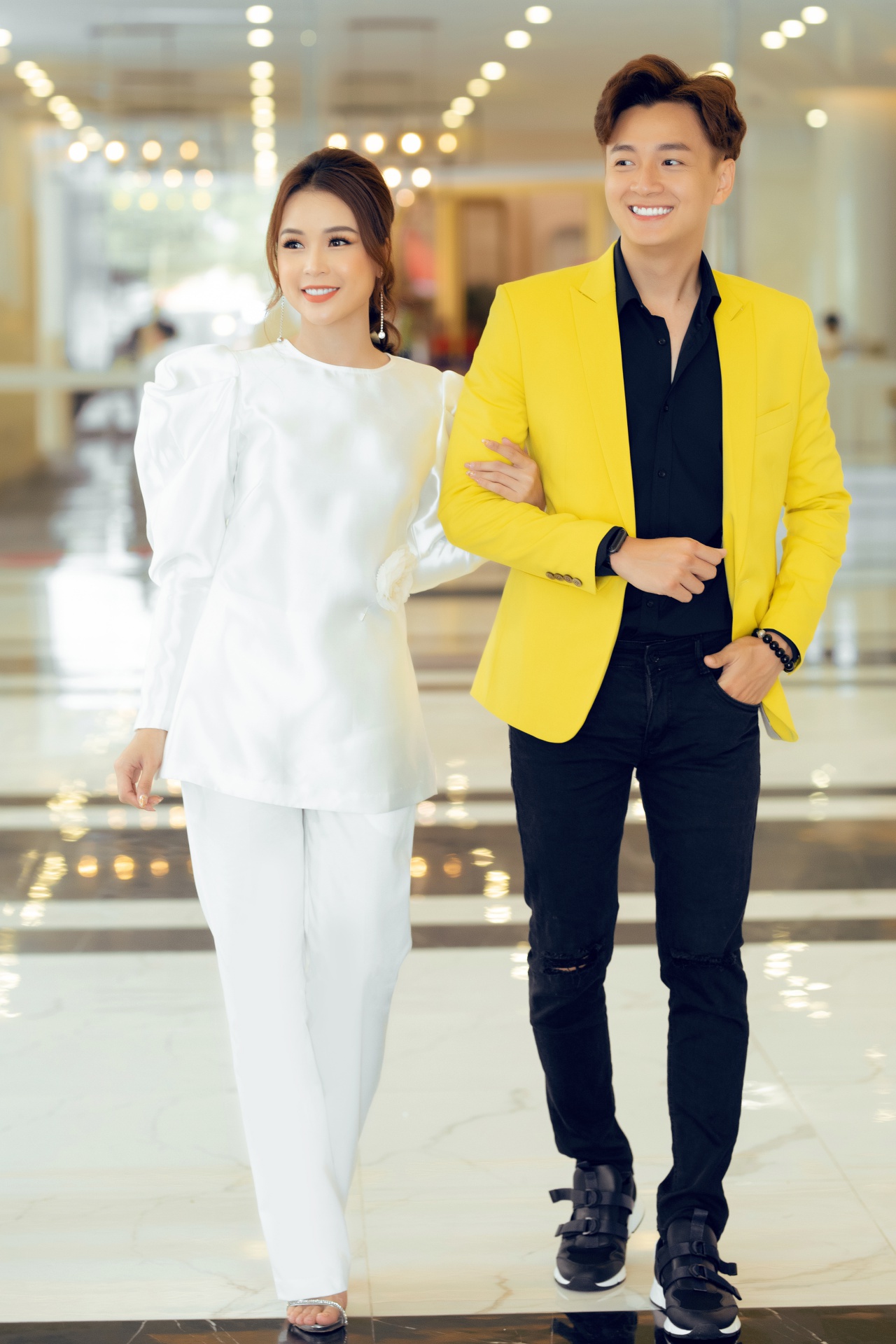 Nam ca sĩ chọn cho mình bộ vest vàng rực rỡ, mix với outfit tông đen khiến tổng thể không quá chói chang nhưng vẫn đảm bảo độ nổi bật. Tại sự kiện, hai người tạo nhiều dáng tình cảm, đáng yêu hết mức.