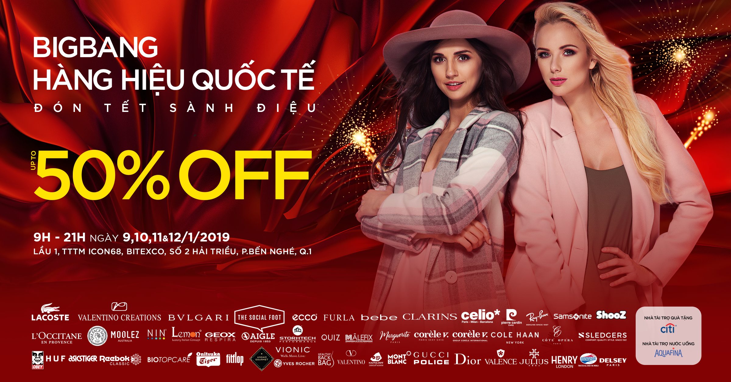 Ngay trong tháng 1 này, tại lầu 1 TTTM Icon68 Bitexco, siêu sale Bigbang Hàng Hiệu Quốc Tế lớn nhất từ trước đến nay sẽ diễn ra suốt 12 tiếng (9 giờ sáng đến 9 giờ tối) trong các ngày 9, 10, 11, 12. Đây là đại tiệc sale đặc biệt với sự góp mặt của hơn 100 thương hiệu quốc tế đi đến đâu là lung linh đến đấy đang “làm mưa làm gió” tại Việt Nam.