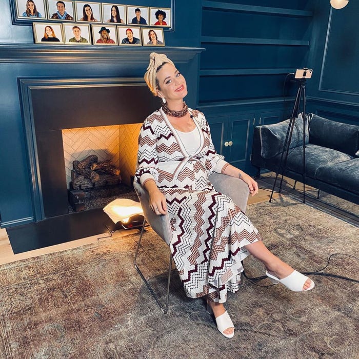Bầu bí nặng nề nhưng Perry vẫn đến biểu diễn trong sự kiện gây quỹ phòng chống Covid 19. Cô mặc một chiếc váy lệch vai và băng đô lấy cảm hứng từ thập niên 70s.