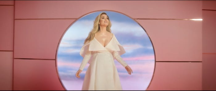 Perry thông báo tin mang thai trong video âm nhạc ‘Never Worn White’. Lúc đó cô mặc một chiếc váy cưới của Alexis Mabille.