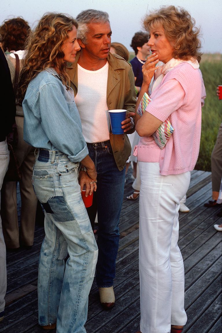 Ricky Lauren, vợ của nhà thiết kế thời trang người Mỹ, Ralph Lauren, mang đến vẻ ngoài denim-on-denim hoàn hảo với quần jean chắp vá với áo sơ mi cài nút nhẹ. Cặp đôi nói chuyện với Barbara Walters tại một bữa tiệc cocktail ở Hamptons.