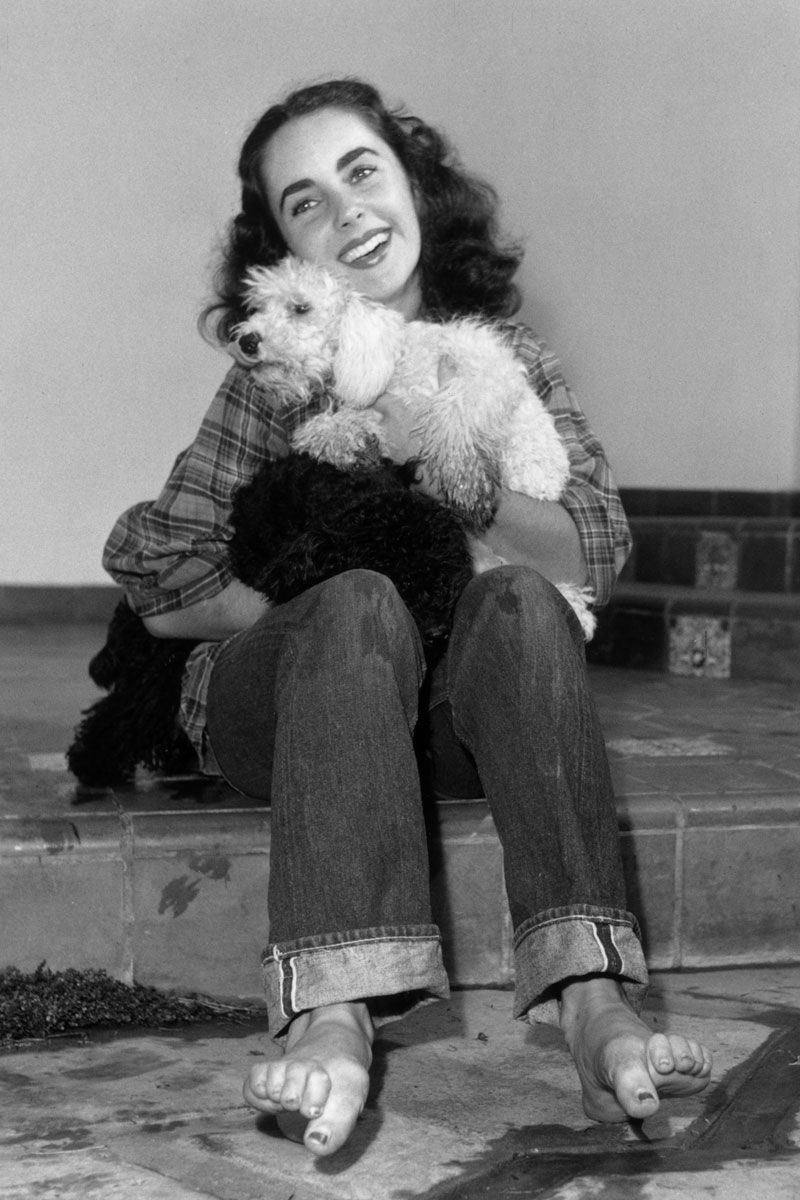 Trong thập niên 40, quần jean được coi là trang phục thường ngày chứ không phải thời trang cao cấp. Chính vì thế mà Elizabeth Taylor kết hợp quần jean với áo sơ mi rộng rãi khi tắm cho chú chó của mình.