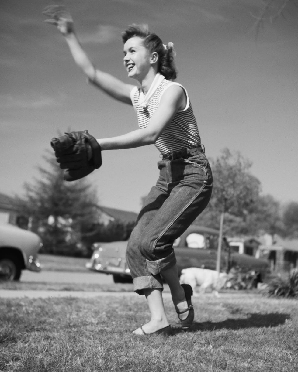 Debbie Reynold được mệnh danh là ‘người yêu của nước Mỹ’. Năm 1950, hình ảnh nữ diễn viên cười rạng rỡ khi chơi bóng chày vẫn luôn được nhắc tới cho đến tận ngày nay. Và áo tank top cùng quần jean cô mặc từ 70 năm trước cũng chưa hề lỗi mốt.