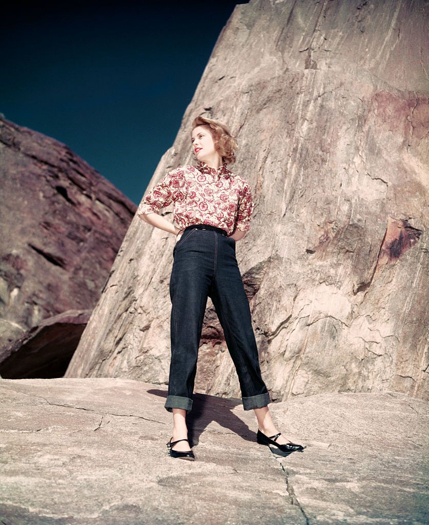 Jane Russell là một trong những ngôi sao quyến rũ nhất trong thập niên 40 và 50. Năm 1949, cô bất ngờ ăn mặc kín đáo với quần jean cạp cao và giày cao bồi nhưng vẫn toát lên vẻ gợi cảm.