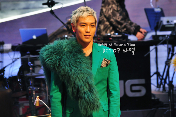 Vest xanh và túm lông xanh trên áo T.O.P làm fan hoa mắt.