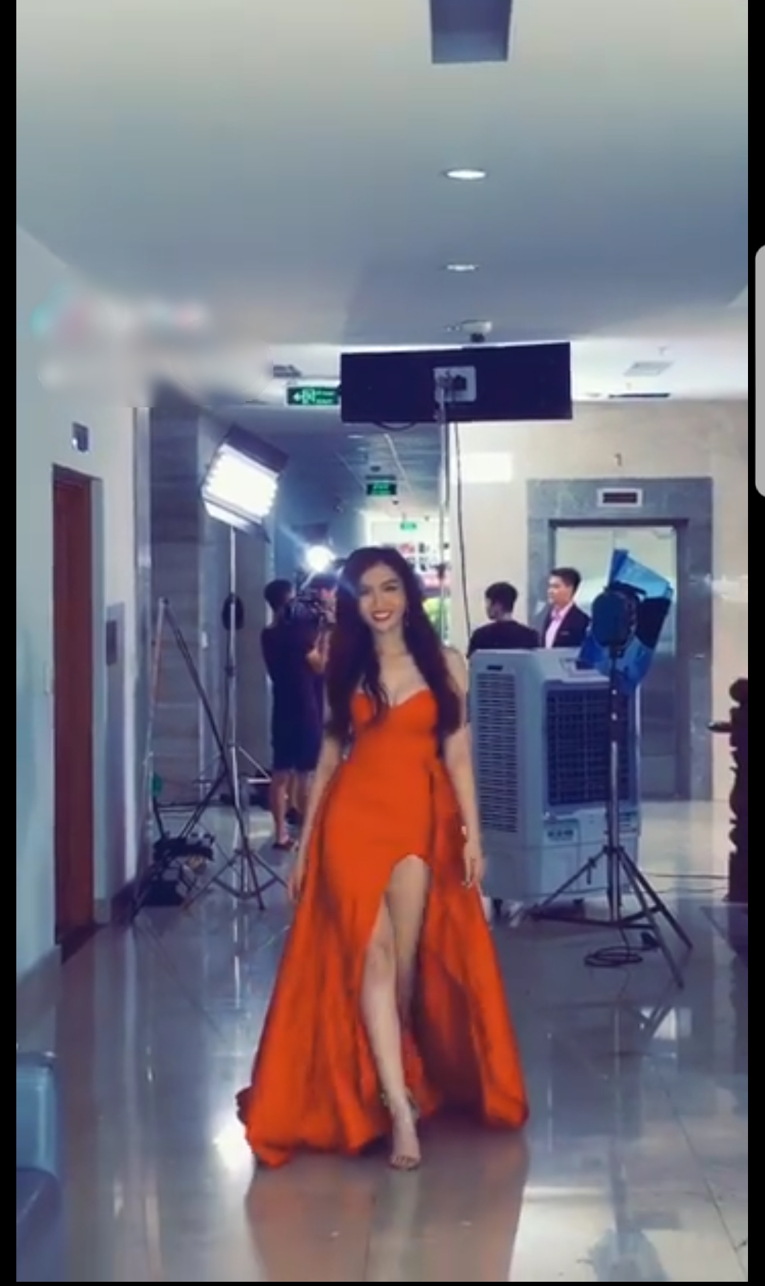 Mái tóc dài suôn thẳng cùng cách trang điểm nhẹ nhàng là hình ảnh của chân dài khi diện trang phục dạ hội xuyên suốt cuộc thi.