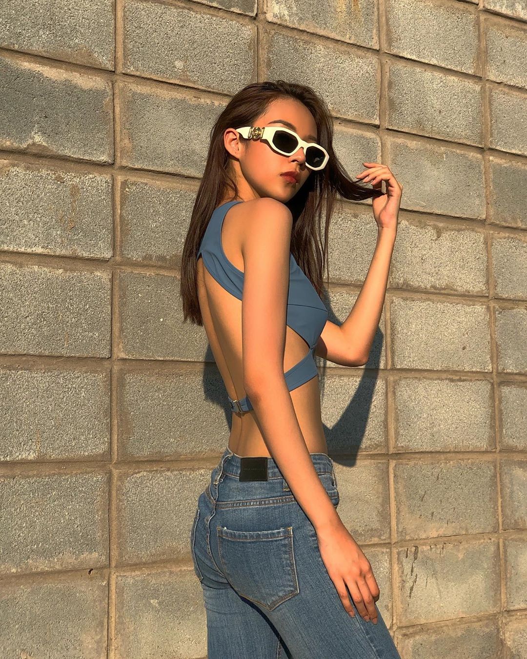 Combo áo hai dây và quần rộng quen thuộc được Khả Ngân sự dụng nhằm khoe triệt để đường cong.