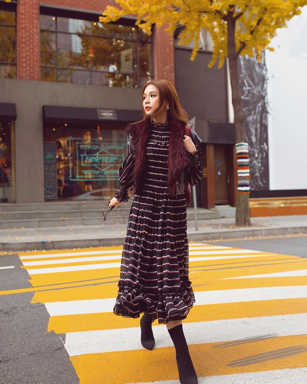 Mới đây, người đẹp tiếp tục khiến bao người ngạc nhiên khi diện bộ cánh mang tông màu đen ấn tượng, có chiều dài qua gối, “kín như bưng”. Thông thường, sắc màu, kiểu dáng này dễ khiến các nàng mang cảm giác “già dặn”, nhưng với Sam thì khác, cô nàng hoàn toàn có cách riêng để khắc phục.