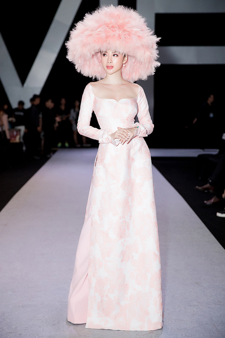 Trong ngày đầu khai mạc VIFW 2018, Angela Phương Trinh thu hút mọi sự chú ý khi diện tà áo dài hồng cùng đội mũ lông chim ấn tượng.