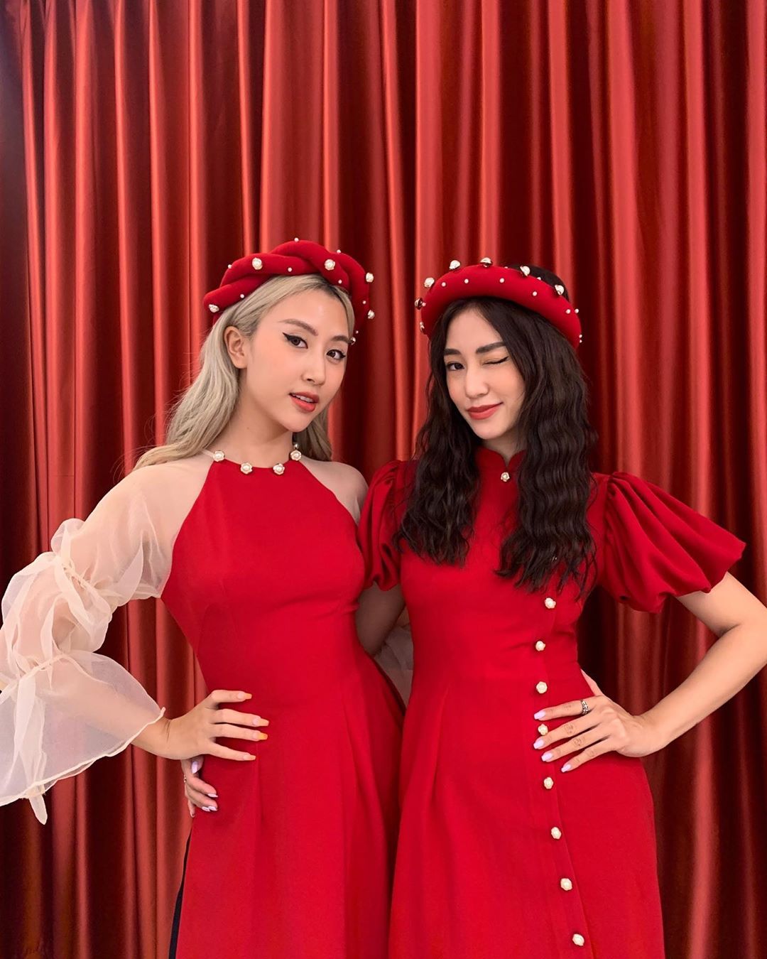 Quỳnh Anh Shyn cùng cô bạn Salim lại ưu ái tà áo dài đỏ ôm eo tay bồng, cách tân xinh xắn.