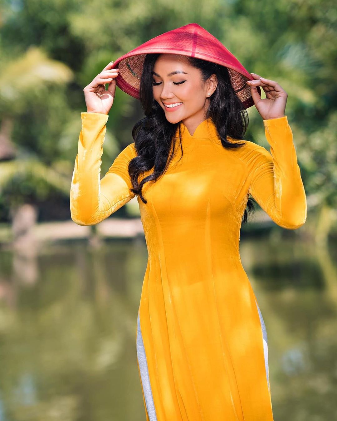 Hình ảnh H'Hen Niê với tà áo dài vàng, mái tóc đen suôn mượt cùng chiếc nón lá tông đỏ thật sự vô cùng đẹp và mang đến không khí Tết Việt tràn đầy.