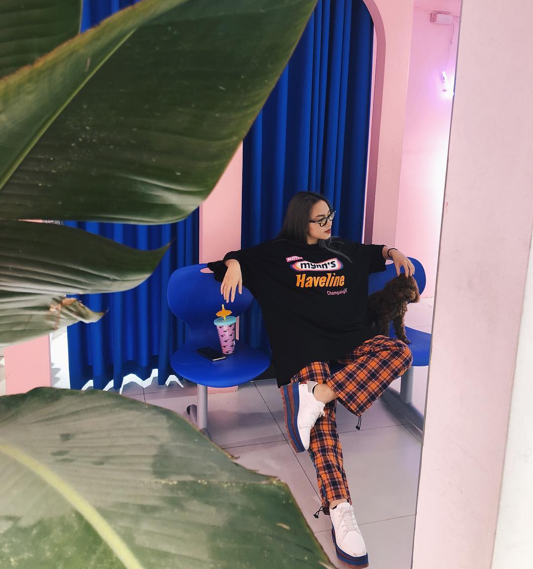 Châu Bùi tiếp tục theo đuổi phong cách streetwear với combo áo phông thùng thình mix cùng quần ống suông họa tiết ca-rô.