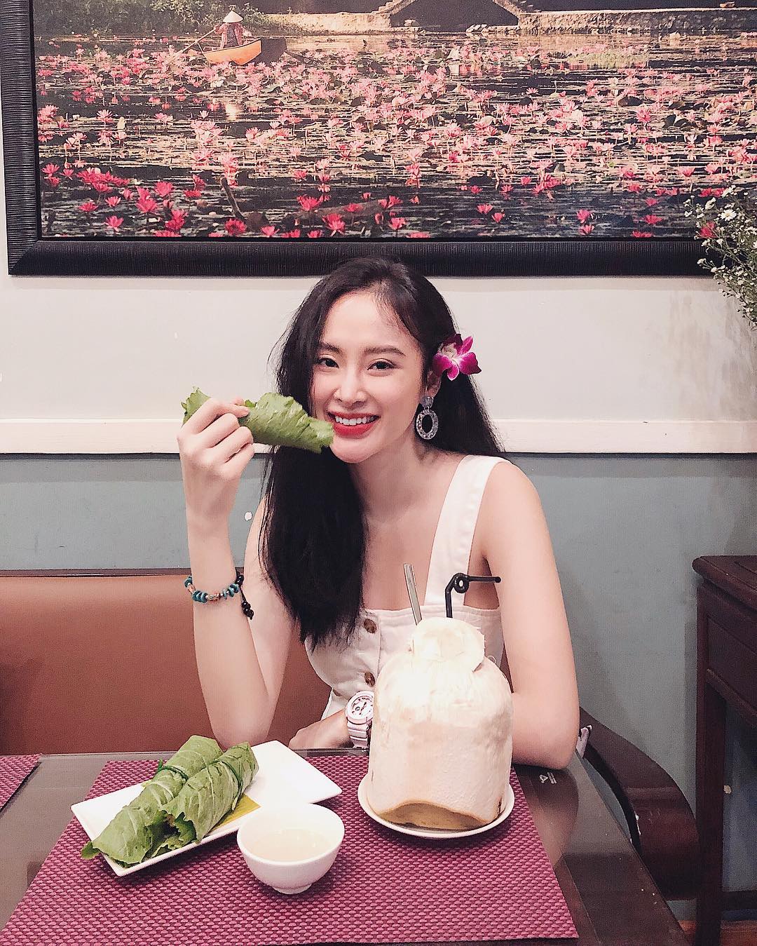Angela Phương Trinh khoe dáng vóc yêu kiều trong chiếc váy hai dây nữ tính. Để phù hợp tổng thể, cô nàng còn quyết định cài hoa lên tóc làm duyên.