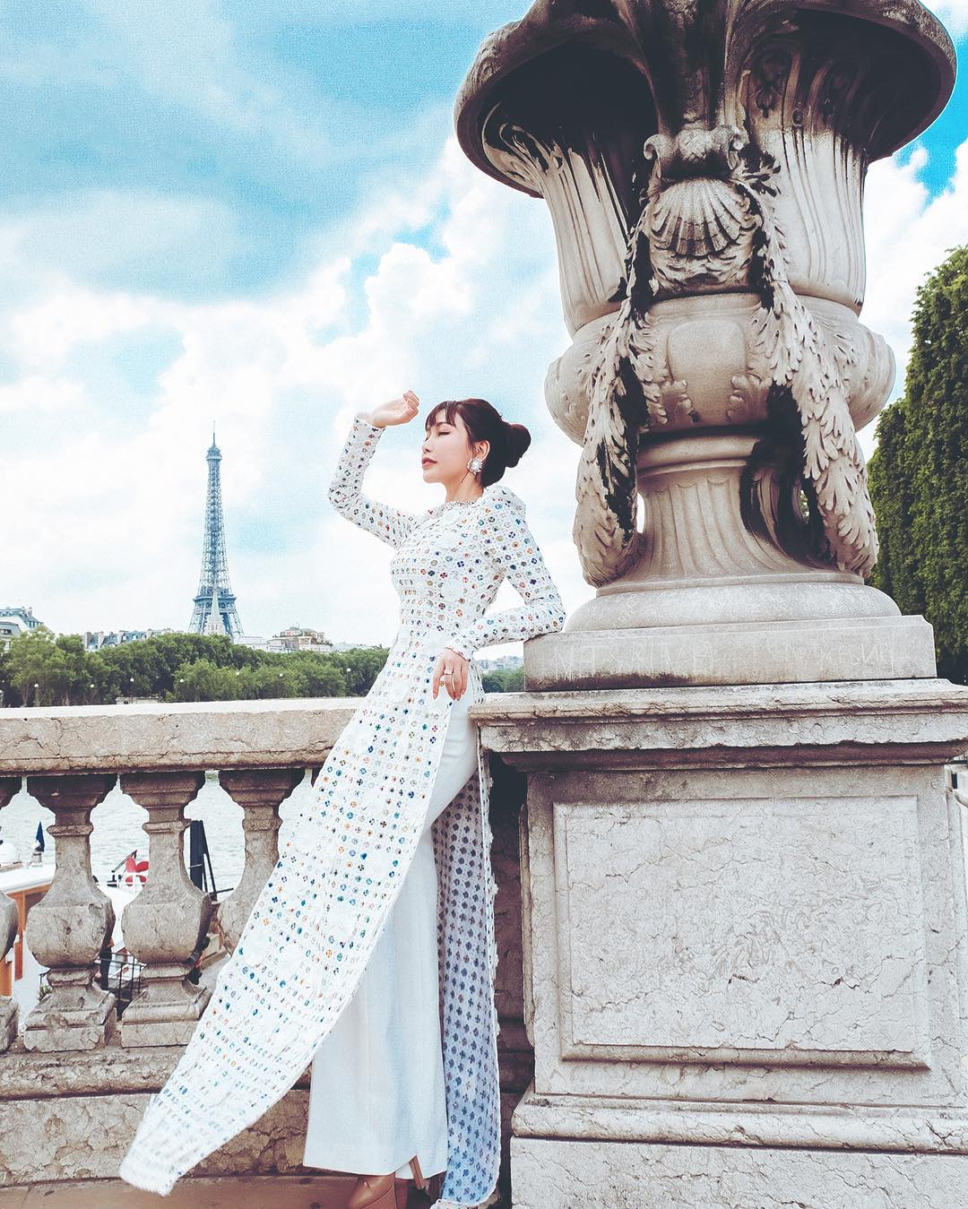 Giọng ca “Ngày mai” khoe vóc dáng gợi cảm trong thiết kế áo dài đính kết của Công Trí. Tuy không quá cao, nhưng nhờ trang phục, góc chụp vẫn giúp cô nàng khoe khéo tỷ lệ hình thể, chân thon dài.