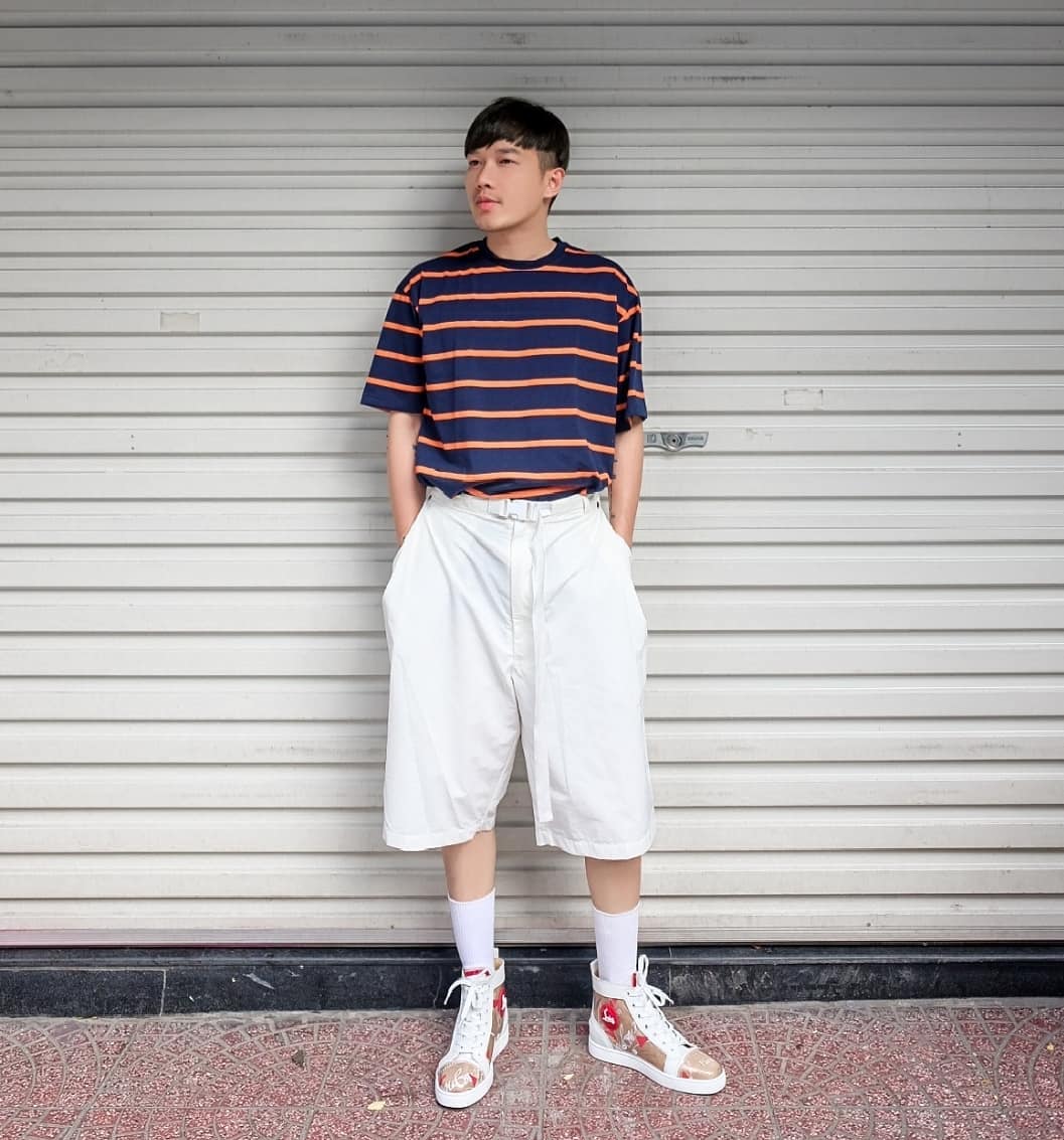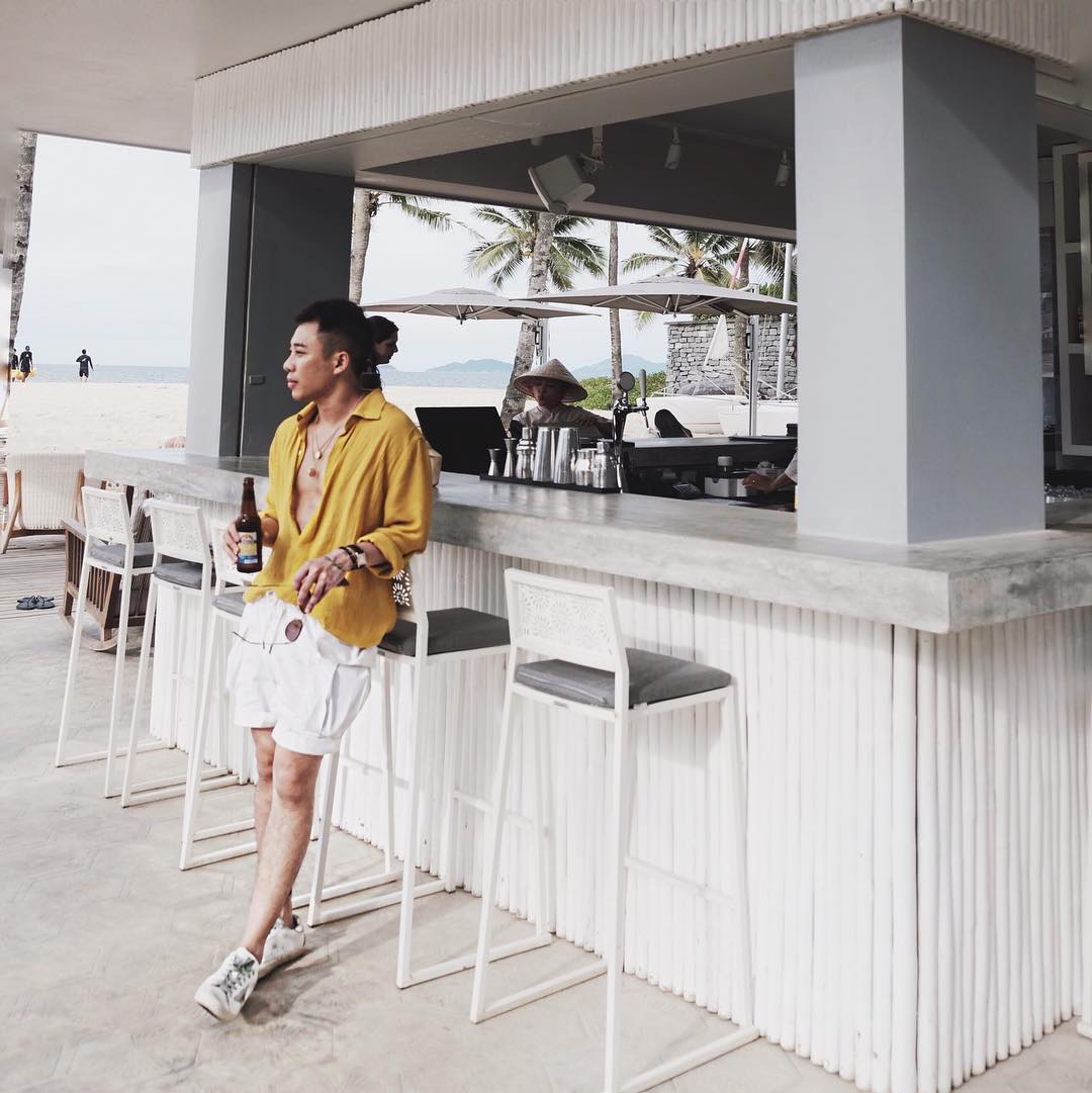 Hoàng Ku mang lại không khí ngày hè cùng sơ-mi vàng khoe ngực trần. Anh chàng mix cùng quần short trắng, tạo thành tổng thể hoàn hảo.