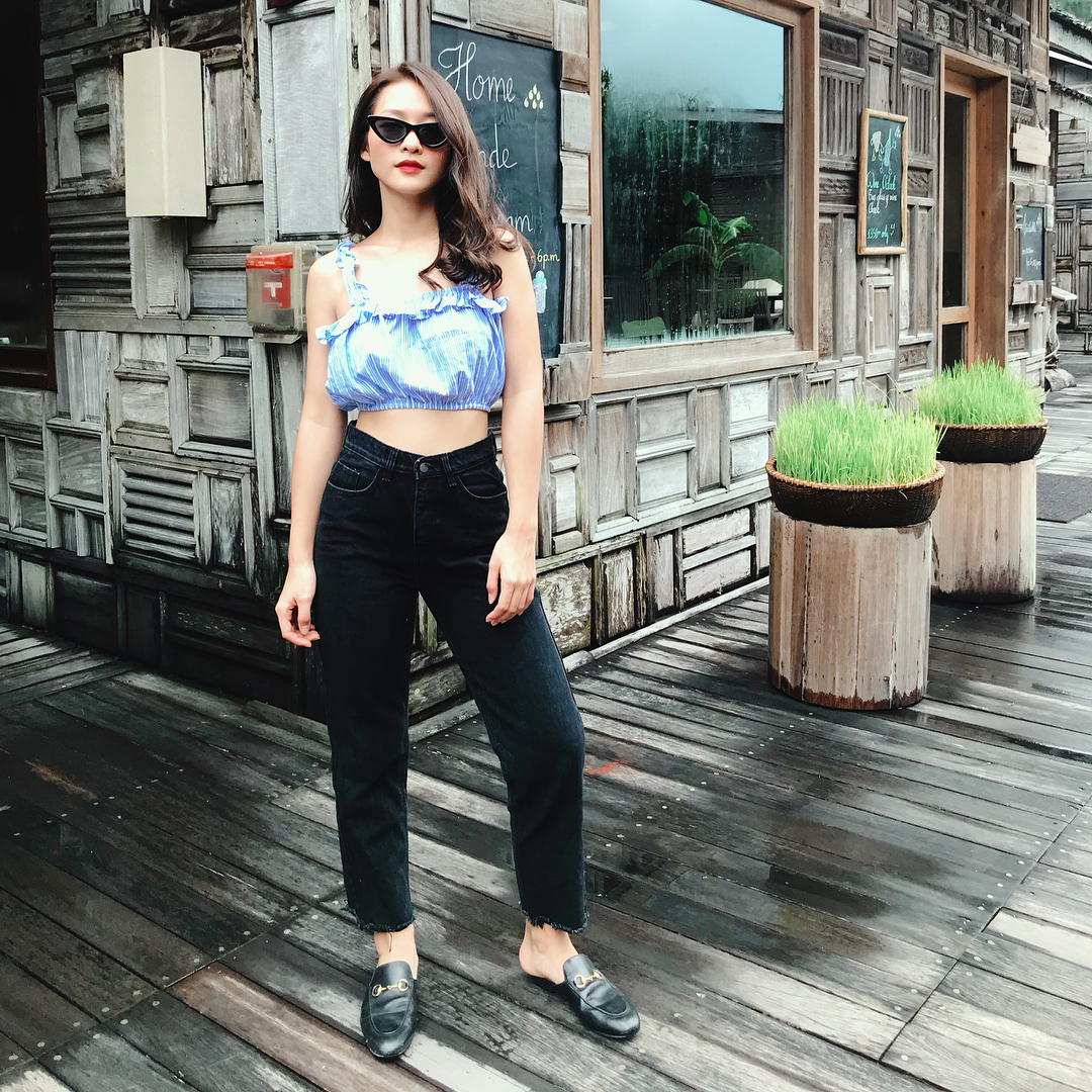 Khánh Ngân The Face vi vu Côn Đảo cùng set đồ gồm áo croptop và jeans rách gấu, mix cùng dép Gucci.