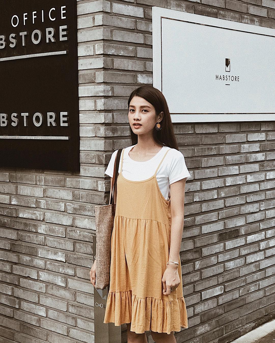 Để chiếc váy dây không trở nên phô phang, Mỹ Duyên The Face chọn cách diện chung với một chiếc áo thun trơn basic bên trong.