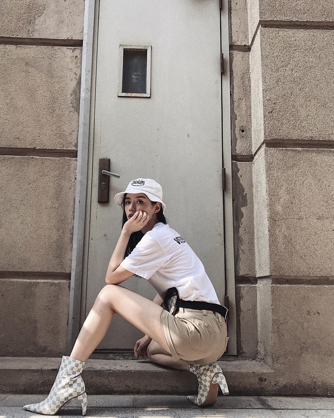 Set đồ tông màu trung tính của Khánh Linh The Face chắc chắn sẽ không thể nổi bật đến thế nếu thiếu đi đôi boots cao có phần gót cong này.