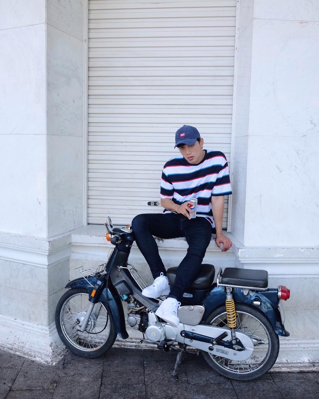 Set đồ năng động, basic gồm áo thun sọc, quầb jeans và mũ lưỡi trai là cách Thuận Nguyễn lựa chọn để tự tin ra phố.