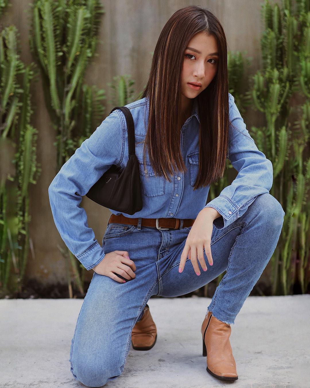 Chỉ với hai tông màu xanh denim và da bò, Quỳnh Anh Shyn đã có ngay cho mình bộ cánh nổi bật.