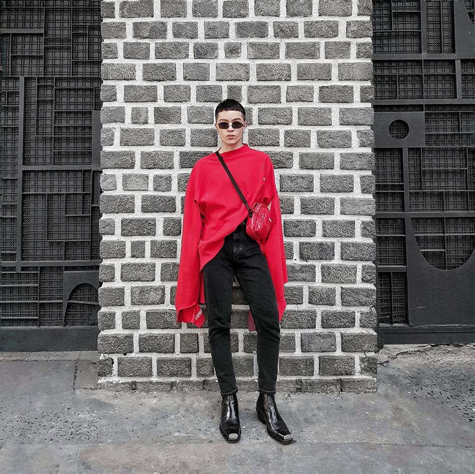 Kelbin Lei vừa khoe street style nóng hổi trong ngày đầu năm với bộ cánh đỏ rực rỡ. Diện áo sweater oversize, Kelbin kết hợp với phụ kiện độc đáo là túi đeo chéo Supreme và giầy mũi vuông của Calvin Klein.