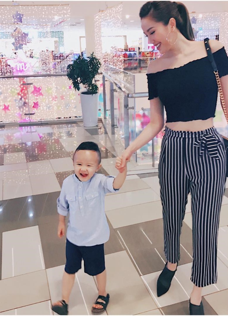 Thay vì tụ họp bạn bè, Bảo Thy dành hẳn ngày lễ để dắt cháu đi chơi. Sự mix - match giữa quần culottes thắt nơ cùng crop top trễ vai khoe giúp cho diện mạo của “Công chúa bong bóng” trông rạng ngời và trẻ trung hơn rất nhiều.