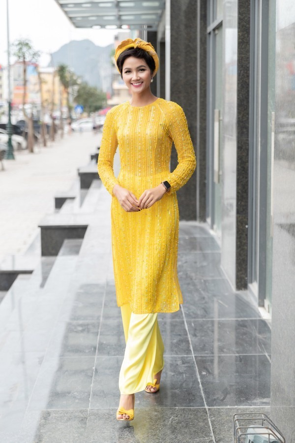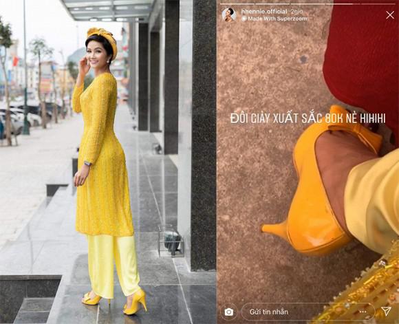 Đôi giày mua từ một cửa hiệu đồ hàng thùng (secondhand) nhưng lại lên đồ sang xịn không thua gì đồ hiệu, nhất là khi đôi giày lại xuyệt tông với bộ áo dài vàng óng của H’Hen Niê.