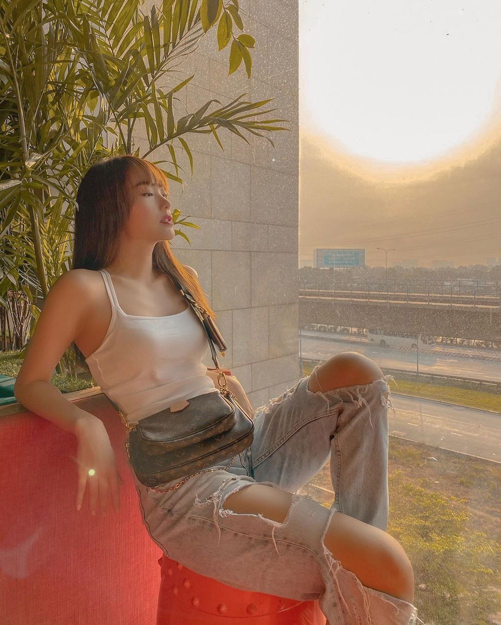 Minh Hằng là người chứng tỏ diện đồ rẻ bèo vẫn có thể “chât lừ”. Cô nàng chuộng quần jean cùng các mẫu áo thun đơn giản. Mẫu áo thun ôm, hai dây người đẹp diện thường được bán theo lô với đủ màu sắc, có giá chưa đến 100 nghìn mỗi chiếc.