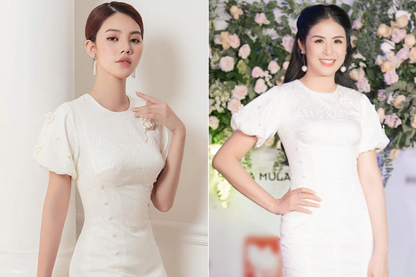 Chiếc váy cocktail màu trắng sang trọng của NTK Nguyễn Quảng trước khi được Tiểu Vy mặc đã được Á hậu Huyền My diện đi sự kiện. Hai người đẹp có cách phối giày dép, kiểu tóc khác nhau.