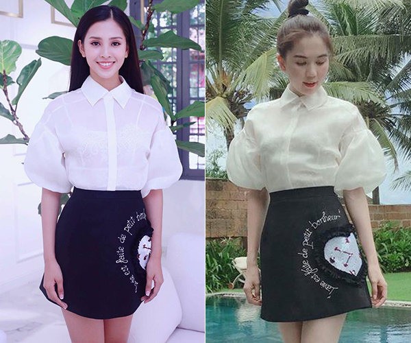 Dù cách nhau tới 10 tuổi, Tiểu Vy và Hoa hậu Việt Nam Hoàn cầu Ngọc Trinh bất phân thắng bại khi cùng mặc một set váy trẻ trung của NTK Đỗ Long.