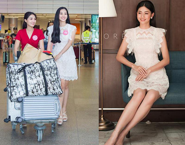 Trước khi được Tiểu Vy mặc ra sân bay, bộ váy ren trắng điệu đà của NTK Nguyễn Quảng đã được Á hậu Thanh Tú diện để chụp hình.