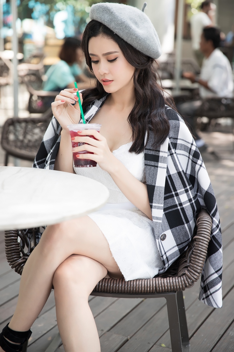 Với chiếc váy trắng đơn giản, Trương Quỳnh Anh lựa chọn cách khoác thêm măng tô ca-rô dáng dài bên ngoài nhằm tạo sự khác biệt.