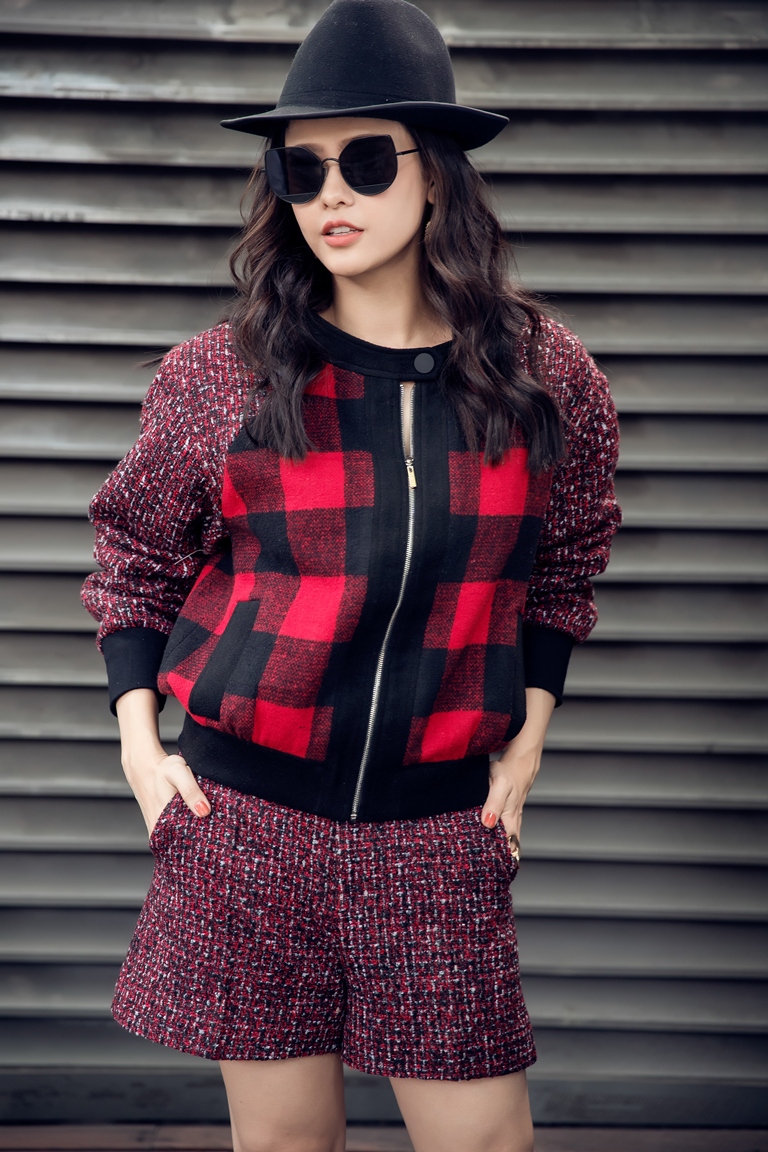 Trong một diễn biến khác, nữ diễn viên lựa chọn áo khoác nỉ ca-rô đi cùng quần short vải bố. Gam màu đỏ, đen nhấn nhá từ áo và quần tạo nên tổng thể vô cùng đồng điệu.