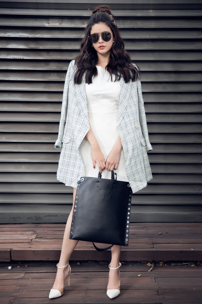Set đồ đã thể hiện được nét duyên dáng, nữ tính của Trương Quỳnh Anh nhưng vẫn đủ thời thượng.