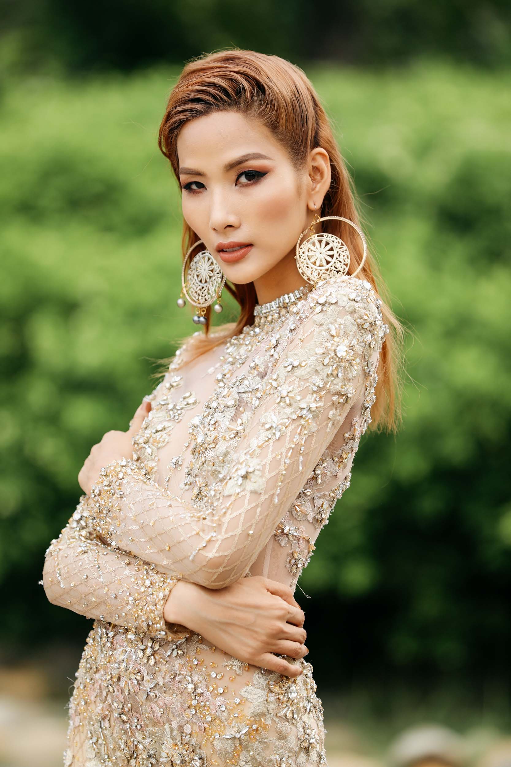 Set đồ xuyên thấu được đính kết hoa và ngọc trai tỉ mỉ trên chất liệu vải cao cấp chạy dọc theo tay và thân. Hoàng Thùy có phần nổi bật và ra dáng là một HLV quyền lực, thể hiện phong độ và đẳng cấp, đủ sức dẫn dắt các thí sinh trong đội của mình.